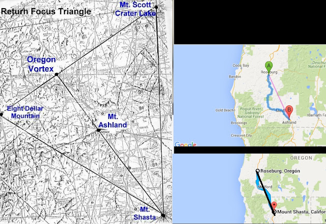 Veamos unas de las líneas ley que pasan por Oregon y que conectan a Roseburg con el famoso monte Ashland y el mágico monte metafísico Shasta: